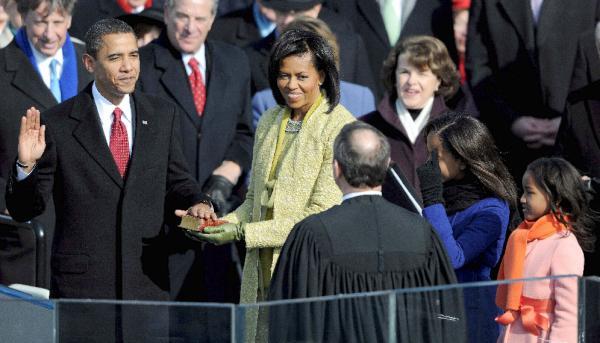 Con un sol radiante, pero un frío intenso, Obama juró sobre la misma Biblia que en 1861 utilizó Abraham Lincoln. La sujetaba su esposa Michelle Obama, quien contemplaba emocionada el momento, al igual que sus dos hijas, Sasha y Malia.