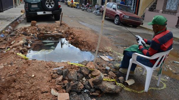 En principio brotaba un poco de agua de una tubería, pero desde hace dos meses empleados de la Corporación del Acueducto y Alcantarillado de Santo Domingo tratan de resolver la situación, pero cada vez es peor.