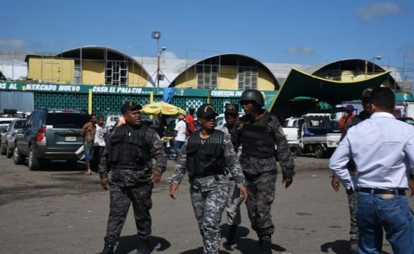 Policías custodian el Mercado Nuevo de la avenida Duarte.