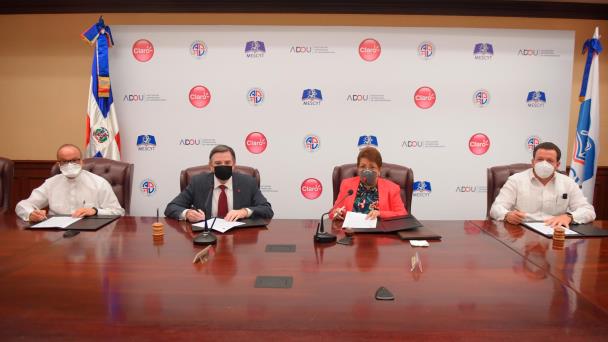 La empresa de telecomunicaciones Claro firmó hoy un convenio de colaboración con el Ministerio de Educación Superior, Ciencia y Tecnología (MESCYT), la Asociación Dominicana de Universidades (ADOU) y la Asociación Dominicana de Rectores Universitarios (ADRU), en el que se compromete a facilitar el acceso a la conectividad de estudiantes y docentes universitarios del país.