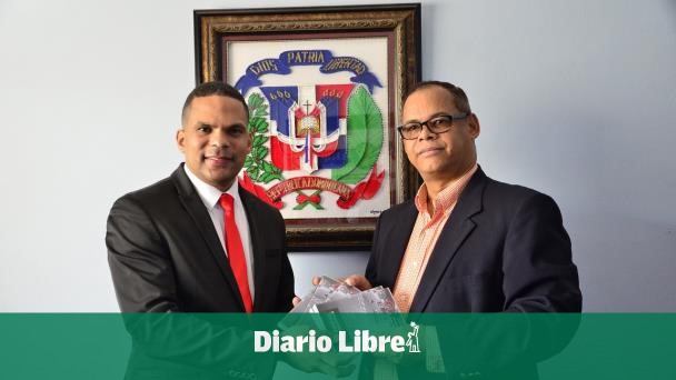 Moisés González Peña, director de Distribución de Gestión Comunicacional de la Dirección General de Comunicación de la Presidencia le hace entrega de los videos de la campaña al reverendo Fidel Lorenzo.