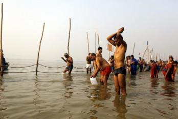 Los primeros en zambullirse, cuando el Sol apenas despunta al otro lado de la confluencia de los dos ríos, son los "sadhus", santones cubiertos de ceniza que dan un grito y se lanzan corriendo, completamente desnudos, a unas aguas gélidas a esa hora.