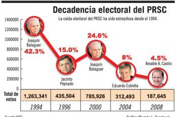 La masiva deserción que desde hace siete años afecta al PRSC en su alto nivel dirigencial, medio y en las bases, ha provocado una estrepitosa caída, a partir de las elecciones del 1994, año en el que ganó los comicios con 1,263,341 votos, frente a 1,253,179 obtenidos por el Partido Revolucionario Dominicano (PRD) y 395,653 sufragios que logró el Partido de la Liberación Dominicana (PLD).