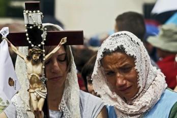 Frente al trajín y la algarabía que se respira en el exterior, en el interior del recinto -todo al aire libre- el ambiente es por momentos cargado y solemne, con rezos multitudinarios, velas encendidas y ojos enrojecidos por las lágrimas.