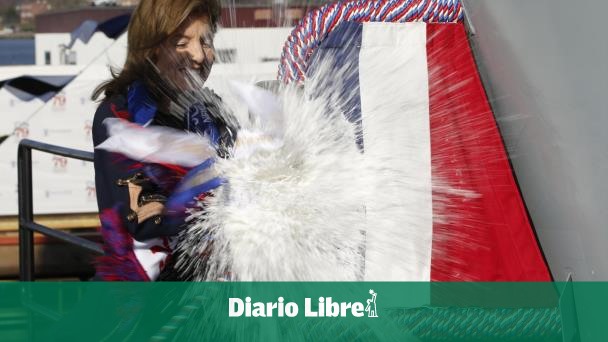 Caroline Kennedy rompió una botella en el casco del barco que lleva el nombre de su padre, John Kennedy, en el astillero de Newport News, Virginia.
