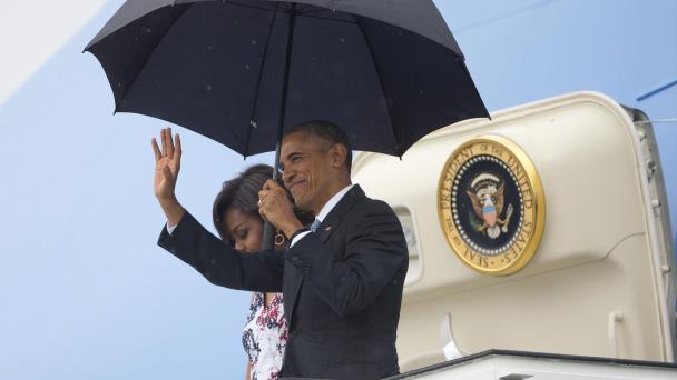 En una inusual tarde lluviosa en La Habana, Obama, su esposa Michelle y sus hijas Malia y Sasha fueron recibidos al pie del avión por el canciller Bruno Rodríguez y otros funcionarios cubanos que participaron en las negociaciones que llevaron al deshielo de las relaciones en diciembre de 2015.