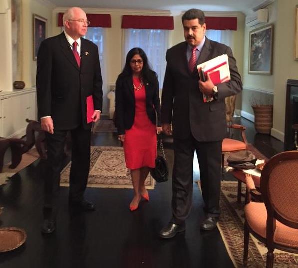 Flores incluyó dos fotografías en las que se aprecia a Maduro con la canciller venezolana, Delcy Rodríguez, y el embajador en la ONU, Rafael Ramírez, saliendo del despacho de Ban Ki-moon en la sede de la ONU.