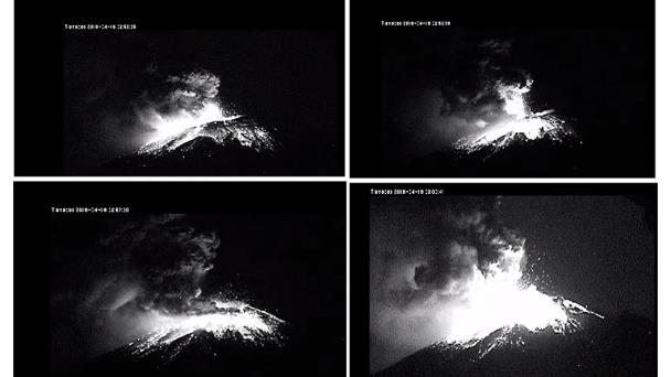 En imágenes de las cámaras que vigilan permanentemente la actividad del volcán, se observó cómo un poderoso estallido desde el cráter iluminó la madrugada de este lunes. Luego, el Popocatépetl empezó a lanzar una densa columna de cenizas mientras material incandescente se derramaba sobre las laderas.