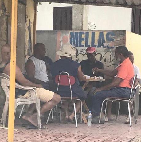Circula una foto en las redes sociales de un grupo de adultos mayores jugando dominó en lo que aparenta ser la acera de un colmado, en Haina, sin ningún tipo de protección pese al aislamiento social establecido por el presidente Danilo Medina por la incidencia del COVID-19 en el país.