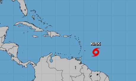 A las 2100 GMT, el vórtice de Kirk se ubicaba a 415 kilómetros (260 millas) al este de Barbados. Tenía vientos máximos sostenidos de 95 kilómetros por hora (60 mph) y se desplazaba con dirección oeste a 30 km/h (18 mph).