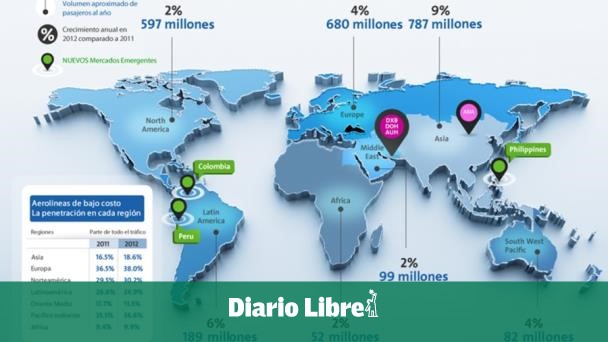 Europa, Norteamérica y el Pacífico sudoeste concentran el tráfico de aerolíneas de bajo costo. Europa cuenta con la mayor concentración de tráfico de aerolíneas de bajo costo, que supone un 38% del total de vuelos en 2012.