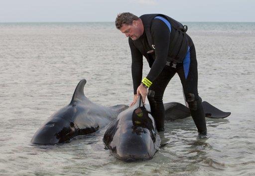 Dos ballenas piloto reciben atención de Art Coakley, del grupo Conservación de Mamíferos