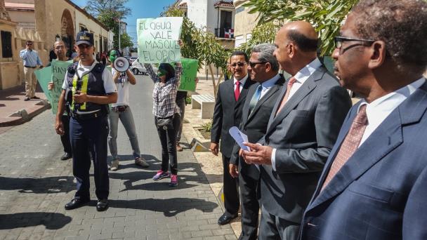 Con pancartas, la entrega de un “recordatorio” para conmemorar “la muerte del medio ambiente en República Dominicana” y de un souvenir consistente en un pedazo de carbón, otro de madera y granos de arena de río, los protestantes exigieron la renuncia del ministro de Medio Ambiente, Bautista Rojas Gómez, en su presencia.