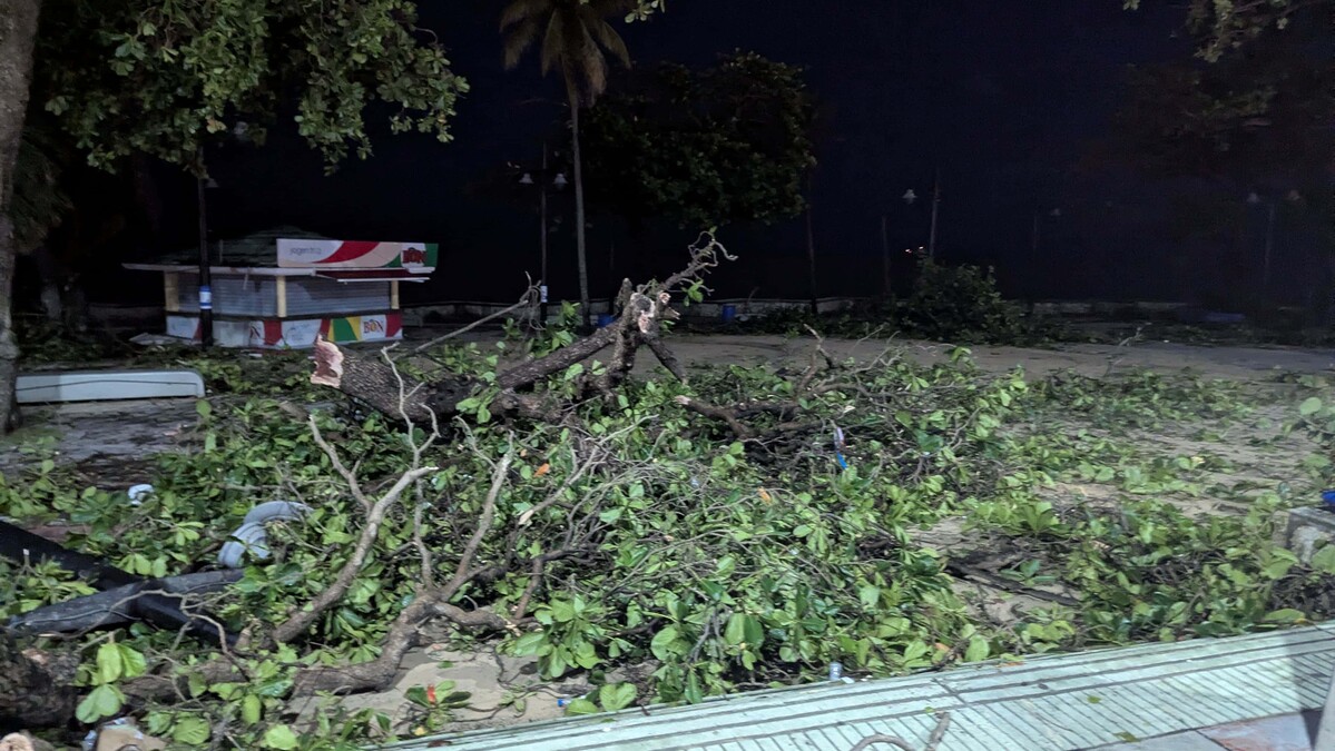 En el área de Güibia se observan numerosas ramas y árboles caídos, así como un poste de alumbrado eléctrico derribado.