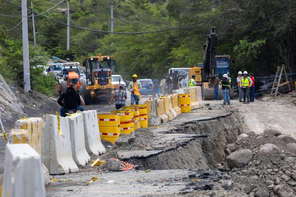 Como parte de las medidas preventivas, las autoridades han colocado muros tipo New Jersey con el objetivo de evitar que los vehículos que se desplazan por la carretera puedan caer al vacío generado por el hundimiento de la vía, mientras continúan las labores en el área.