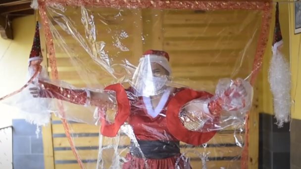 La pandemia de coronavirus redujo al mínimo el contacto físico y las reuniones. Aun así, "Mamá Noel" se las ingenió para seguir regalando abrazos y juguetes a niños pobres del sureste de Brasil, usando una cortina plástica de protección.