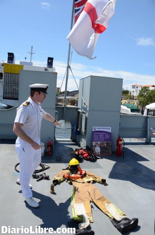 El oficial de navegación Ben Read mostró a DL parte del interior y exterior del barco HMS Severn. El recorrido incluyó explicaciones de la indumentaria para respuesta ante fuegos y rescate del agua, equipos para emergencias médicas, armamento para situaciones de seguridad y el puente de mando.