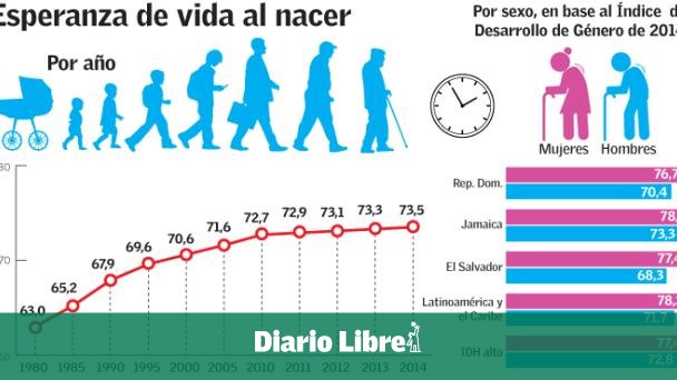 SANTO DOMINGO. Hace unos 34 años, en 1980, para ser más exactos, el tiempo que en promedio podía esperar vivir una persona en la República Dominicana era 63 años. En 2014 aumentó a 73.5, significando que la esperanza de vida al nacer en el país subió 10.5 años.