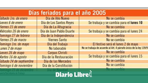 Cuatro días feriados serán cambiados de fecha en el año 2005, mientras que otros ocho mantendrán inalterable su festividad, según el calendario que prepara cada año la Secretaría de Trabajo. El cambio de las fechas se realiza acogiendo las disposiciones de la Ley 139-97, que establece el traslado de los días festivos.