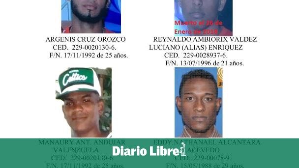 Los hombres que la Policía persigue son Argenis Cruz Orozco, de 25 años; Manaury Antonio Andújar Valenzuela, de 25 y Eddy Nathanael Alcántara Acevedo, de 29.