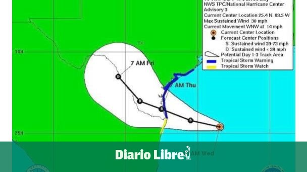 El aviso de tormenta tropical afecta durante las próximas 24 horas a la costa de Texas, desde Freeport hacia el sur, y a la costa nordeste de México, desde Río San Fernando hacia el norte.