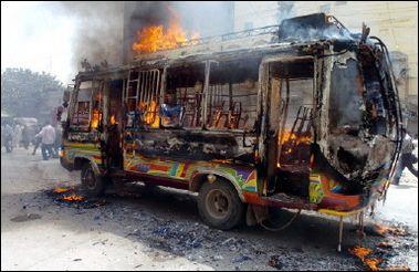 Tras el suceso, unas 5.000 personas, enarbolando banderas negras, se lanzaron a las calles de Karachi y dieron rienda suelta a su furia quemando motocicletas, vehículos y hasta un autobús y un coche de bomberos.