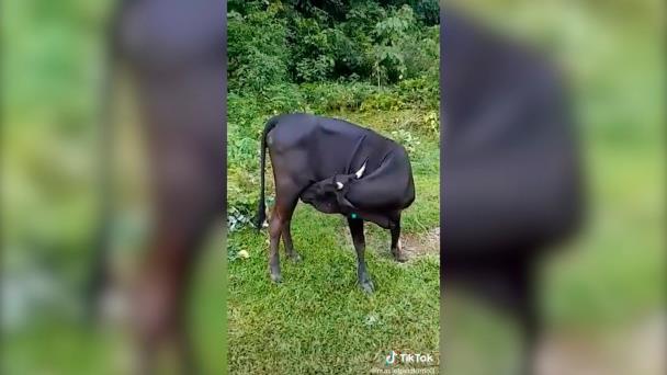 Un video muestra en momento cuando una vaca se ordeña a sí misma. El animal gira hacia su costado derecho y se dispone a alimentarse de su ubre.