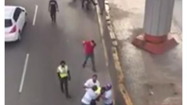 SANTO DOMINGO. Circula en las redes sociales un video de un incidente entre varios agentes policiales de la Autoridad Metropolitana del Transporte (AMET) y dos ciudadanos ocurrido la mañana de este viernes en la avenida John F. Kennedy bajo el elevado de la avenida Winston Churchill.
