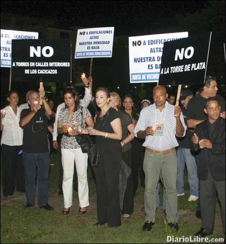 Santo Domingo. Residentes de Los Cacicazgos y otros sectores cercanos a la construcción de la Torre de Plata, ubicada en los terrenos del Hotel Dominican Fiesta, realizaron una vigilia anoche en protesta por las sentencias que favorecen el levantamiento de la obra.
