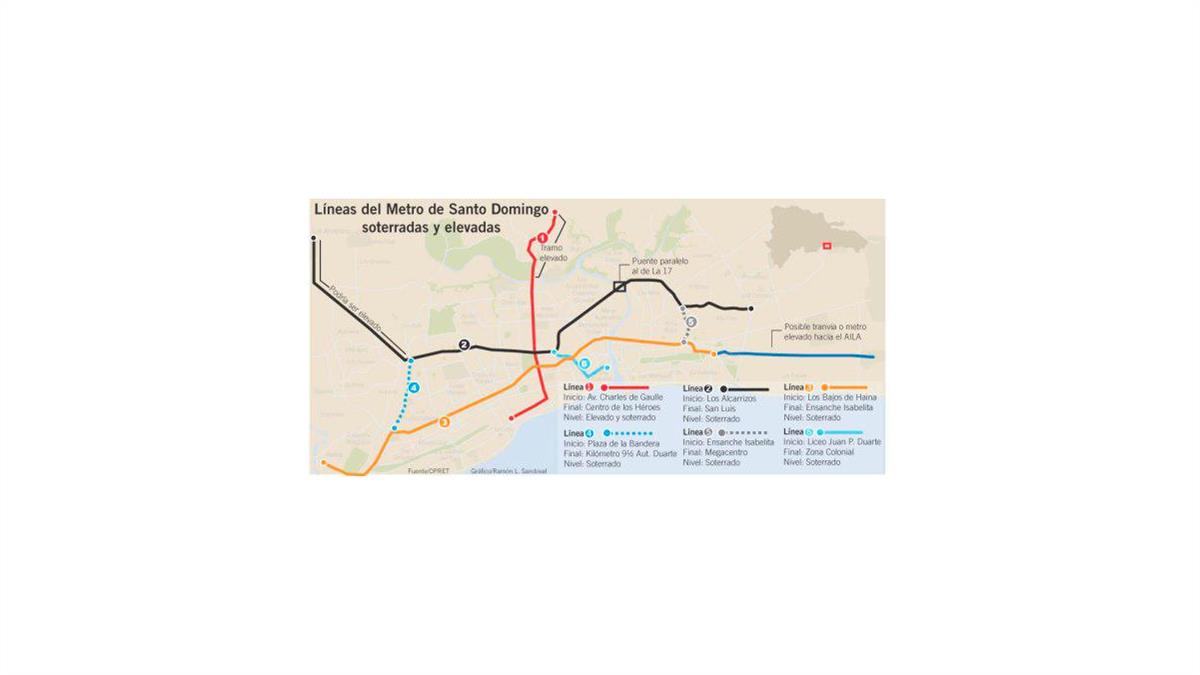 En tanto, la Línea 5 conectaría el ensanche Isabelita con la estación Concepción Bona (L2), en Santo Domingo Este.