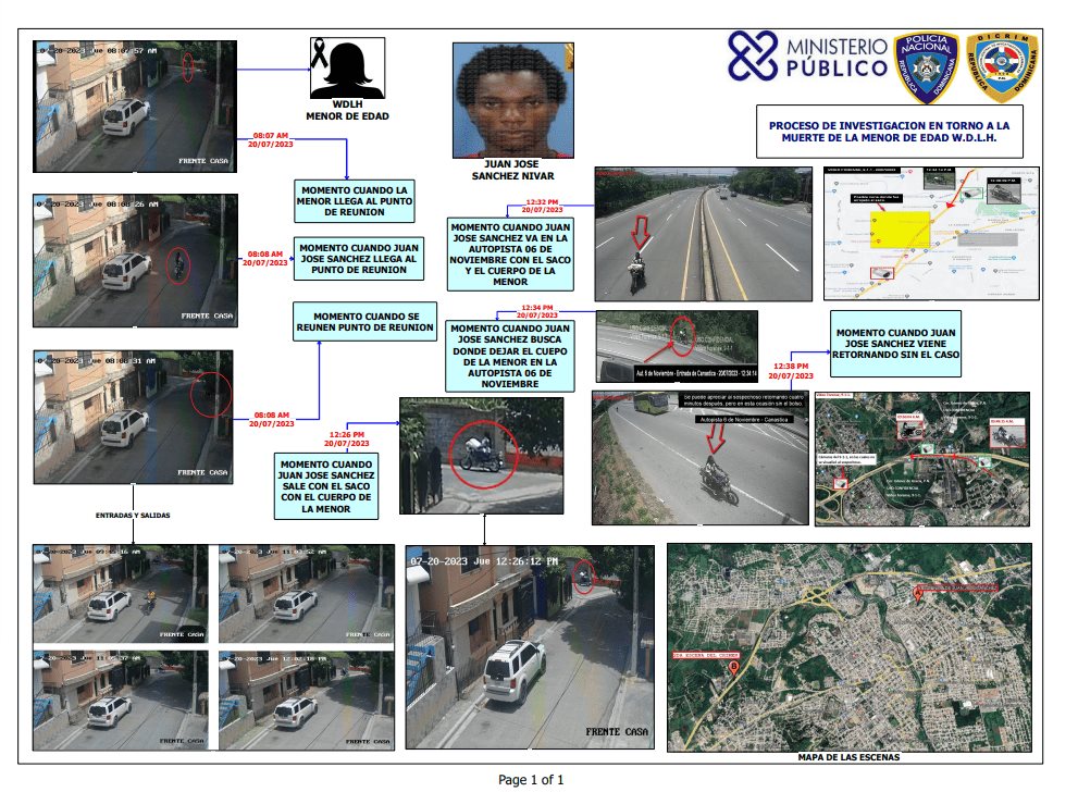 Imágenes de una cámara de vídeo del Sistema de 9-1-1, permitieron determinar que ese mismo día, a las 12:26 de la tarde, cuatro horas y 19 minutos después, que el hoy detenido salió de su residencia conduciendo su motocicleta y llevando un saco en la parte delantera, el cual se presume que contenía el cuerpo sin vida de la niña.