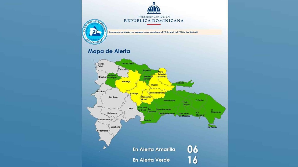 Las provincias en alerta amarilla son: María Trinidad Sánchez, Monseñor Nouel, Santiago, La Vega, Duarte (especialmente el Bajo Yuna) y Sánchez Ramírez.