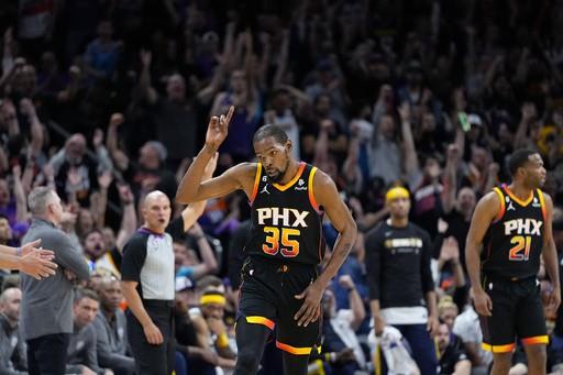 Devin Booker anotó 36 puntos y repartió 12 asistencias, Kevin Durant también logró 36 unidades y los Suns de Phoenix vencieron 129-124 a los Nuggets de Denver para igualar la serie de playoffs de la Conferencia Oeste con dos triunfos por bando.