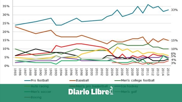 Mientras tanto, el número de personas que recogió el béisbol se redujo de 16% en 2014 al 15% el año pasado. En su pico de popularidad en 2011, la NFL tenía una ventaja de 23% con relación a la MLB. Esa brecha es ahora sólo el 18%.