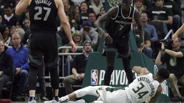 Giannis Antetokounmpo corrió por la cancha e hizo clavada tras clavada hasta que los Pistons acabaron empujándole al suelo.