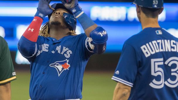 Guerrero fue movido un puesto en la alineación y llegó al plato con las bases llenas en la primera entrada. Teoscar Hernández conectó rodado al tercera base Matt Chapman, quien tiró a segunda para un out forzado, pero el tiro del segunda base Jurickson Profar a la inicial intentando una doble matanza fue un error que permitió una segunda carrera. Los árbitros originalmente llamaron interferencia de Grichuk deslizándose sobreProfar, pero la llamada se invirtió en una revisión de video.