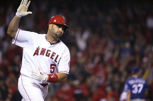 ANAHEIM, California, EE.UU. El dominicano Albert Pujols pegó un sencillo con las bases llenas y dos outs en el noveno inning para dar a los Angelinos de Los Ángeles su primera victoria de la temporada al imponerse el jueves por 4-3 a los Rangers de Texas.