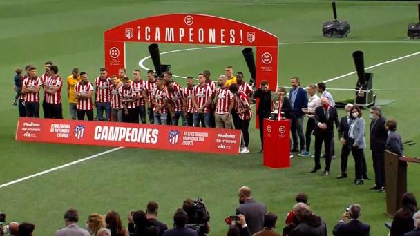 El Atlético de Madrid recibió este domingo en su estadio, el Wanda Metropolitano, la copa del campeón de LaLiga Santander 2020-21, obtenida en la última jornada tras ganar este sábado por 1-2 al Valladolid.