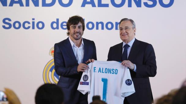 MADRID. El piloto asturiano Fernando Alonso, doble campeón del mundo de Fórmula Uno en 2005 y 2006, recibió este lunes el reconocimiento del Real Madrid al entrar en el selecto grupo de Socios de Honor del club, cuyo presidente, Florentino Pérez, le obsequió con una camiseta con el número uno.