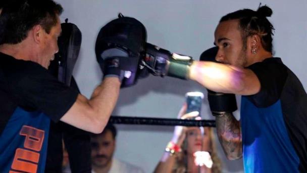 Después de un abrazo y de un intercambio de palabras, los dos destacados deportistas hicieron guantes con preparadores físicos y Hamilton probó a hacer fintas y movimientos defensivos, que le permitieron dejar una buena impresión en uno de sus deportes favoritos.