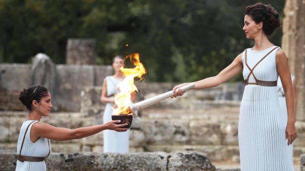 Esta circunstancia no impidió la ceremonia, que se celebra cada dos años en Olimpia -con motivo de los Juegos de Invierno y de Verano-, al sur del Peloponeso: hombres convertidos en luchadores de hace más de 25 siglos, mujeres ataviadas con largos vestidos, coreografías a golpe de tambor...