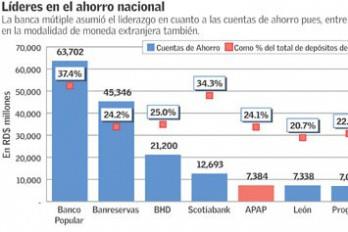 En términos absolutos, los líderes del ahorro son bancos múltiples, donde el ahorro es el 30% de sus depósitos. Compárese con las tres asociaciones A&P (la Popular, Cibao y La Nacional), donde el ahorro no supera el 24.1%.