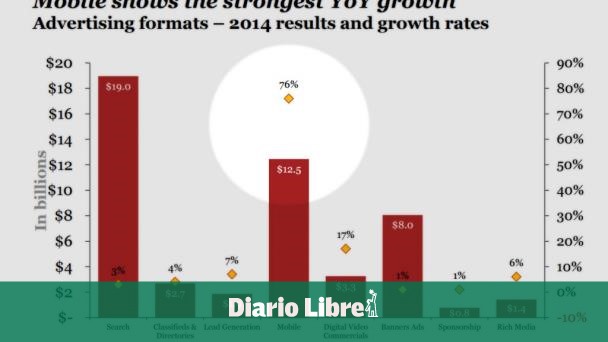 El gasto en la plataforma móvil ahora representa una cuarta parte de los ingresos totales por anuncios en el Internet, una cifra mayor que el 17 por ciento en el año 2013 y más de la cuota del 16 por ciento lograda por los anuncios en pancartas. El gasto en publicidad en línea en general aumentó un 16 por ciento hasta la cifra récord de $49.5 mil millones en 2014, y redujo la brecha con la televisión.