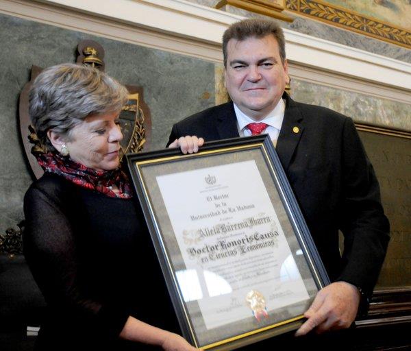 En la misma jornada, la secretaria de Cepal recibió el título de Doctor Honoris Causa en Ciencias Económicas que le otorgó la Universidad de La Habana “por su incesante compromiso con la defensa de las causas justas en la región”.