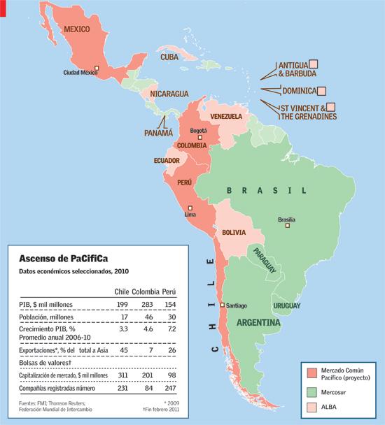 Durante las últimas dos décadas se han sostenido innumerables conversaciones sobre la integración regional latinoamericana, pero ha habido mucho menos acción. En la década de 1990 Brasil y Argentina crearon el Mercosur, un grupo de cuatro países. El Pacto Andino de cinco países se convirtió en la Comunidad Andina. Ambos estaban basados en una visión (moderada) de libre comercio y en la expansión de los mercados. Pero hace una década una cosecha de gobiernos de izquierda asumió el poder en gran parte de la región con una visión diferente. Brasil suspendió las conversaciones de un área de 34 países de libre comercio para las Américas, incluyendo a los Estados Unidos, y en su lugar patrocinó la Unión Sudamericana (UNASUL por sus siglas en portugués) como un foro de cooperación política. Entretanto, Hugo Chávez, el presidente de Venezuela, formó ALBA, un bloque anti Estados Unidos, con Cuba y otros aliados.