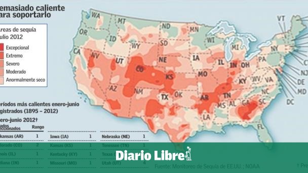 A través de los Estados Unidos los campos están resecos, el maíz se marchita, los embalses están bajos, los ríos se están secando y han estallado fuegos en Utah y Colorado. Condiciones serias de sequía están afectando a la mayoría de los 48 estados contiguos, y un nuevo informe del Centro Nacional Climático del 10 de julio dice que el 55% de los Estados Unidos continental está afectado por sequía moderada a extrema y una tercera parte por sequía severa a extrema (ver mapa).