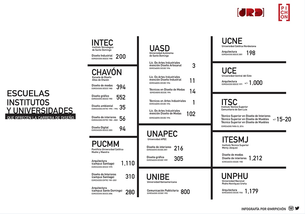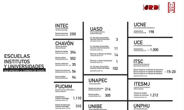 En la siguiente infografía, se ven las escuelas, los institutos y las universidades que ofrecen la carrera de Diseño en República Dominicana y cuántos diseñadores industriales se han graduado en estas: