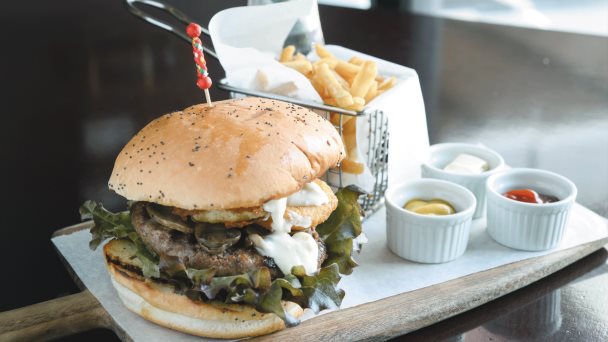 El blue cheese se apodera de esta hamburguesa: un crumble en la base; y salsa para el topping. La carne es de 8 ozs. y viene acompañada con una lechuga morada. Champiñones y aros de cebolla para hacerla irresistible. De hecho, Alessandro Stassi, chef de Sonoma, asegura que es una combinación de “ingredientes curiosos” al sabor.