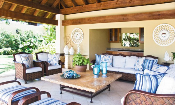 Para las áreas exteriores de la casa, como la terraza y el gazebo, Bonilla utilizó el mármol crema, pero con un nivel de envejecimiento mayor y con toques de cenefas en piedras de lajas o pizarras.