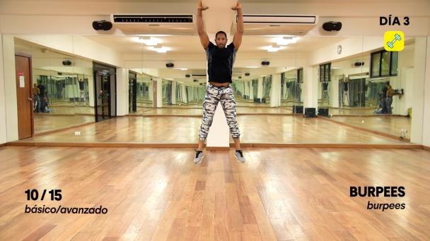 Haz una sentadilla para colocar tus manos en el piso y afuera de los pies. Lleva tus piernas hacia detrás con un salto y de inmediato una pechada. Regresa las piernas hacia delante en posición de sentadilla y empújate hacia arriba con un salto.